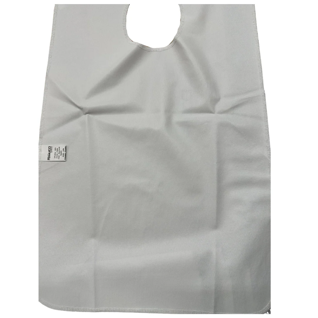 Bavaglio in spugna di cotone accoppiato con poliuretano impermeabile indicato per prevenire macchie sui vestiti. Chiusura a strappo sul collo regolabile, lunghezza standard. Consigliato anche per case di cura e strutture sanitarie per prevenire sporco sui pazienti.