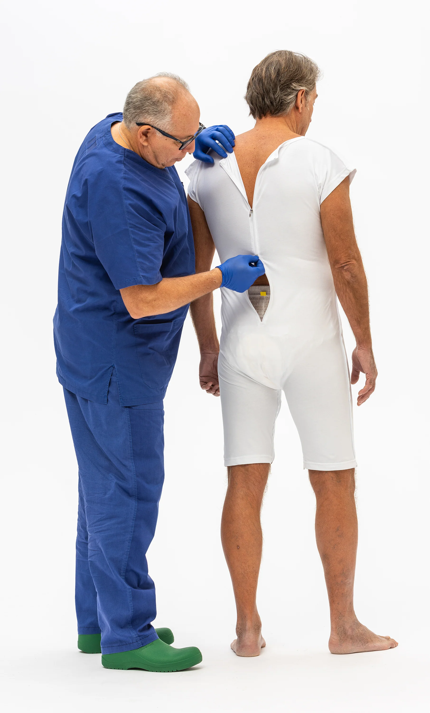 Dotato di cerniera posteriore a doppio cursore che permette agli operatori anche il solo controllo dello stato igienico evitando di spogliare inutilmente l'ospite.