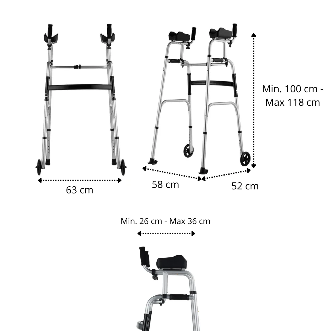 - Deambulatore pieghevole realizzato in alluminio, altamente resistente a intemperie e utilizzabile su qualsiasi tipo di suolo. Dotato di 2 ruote anteriori e di supporto agli avambracci. Regolabile in altezza su 8 livelli. Regolabile anche su lunghezza avambracci. Portata max 100 KG.