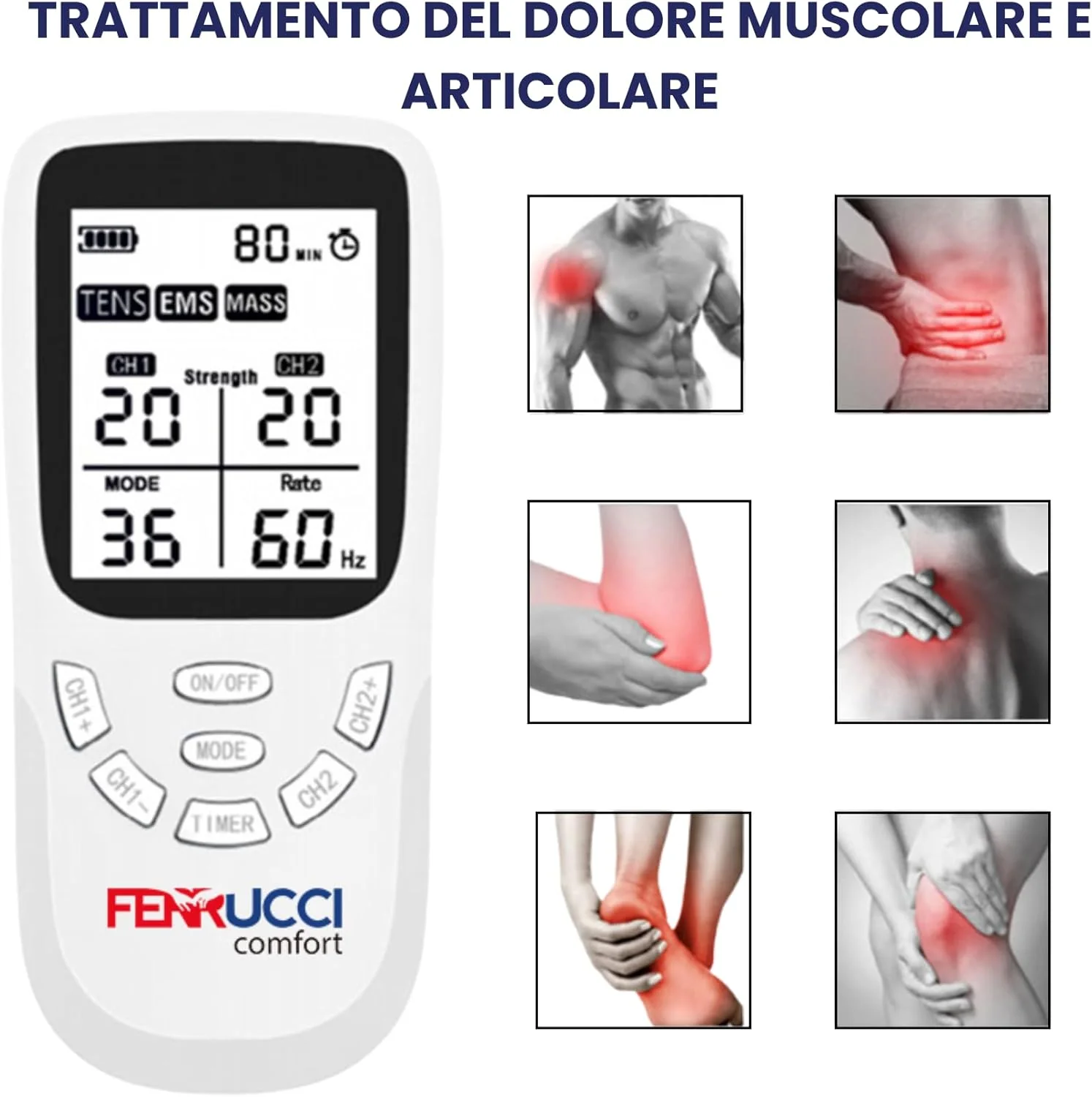 - Terapia 3 in 1 per il Benessere Muscolare Ferrucci Comfort: Combina TENS, EMS e massaggi rilassanti in un unico dispositivo per stimolare i muscoli e alleviare la tensione e trattare i dolori cronici a schiena, collo, gambe ed articolazioni.