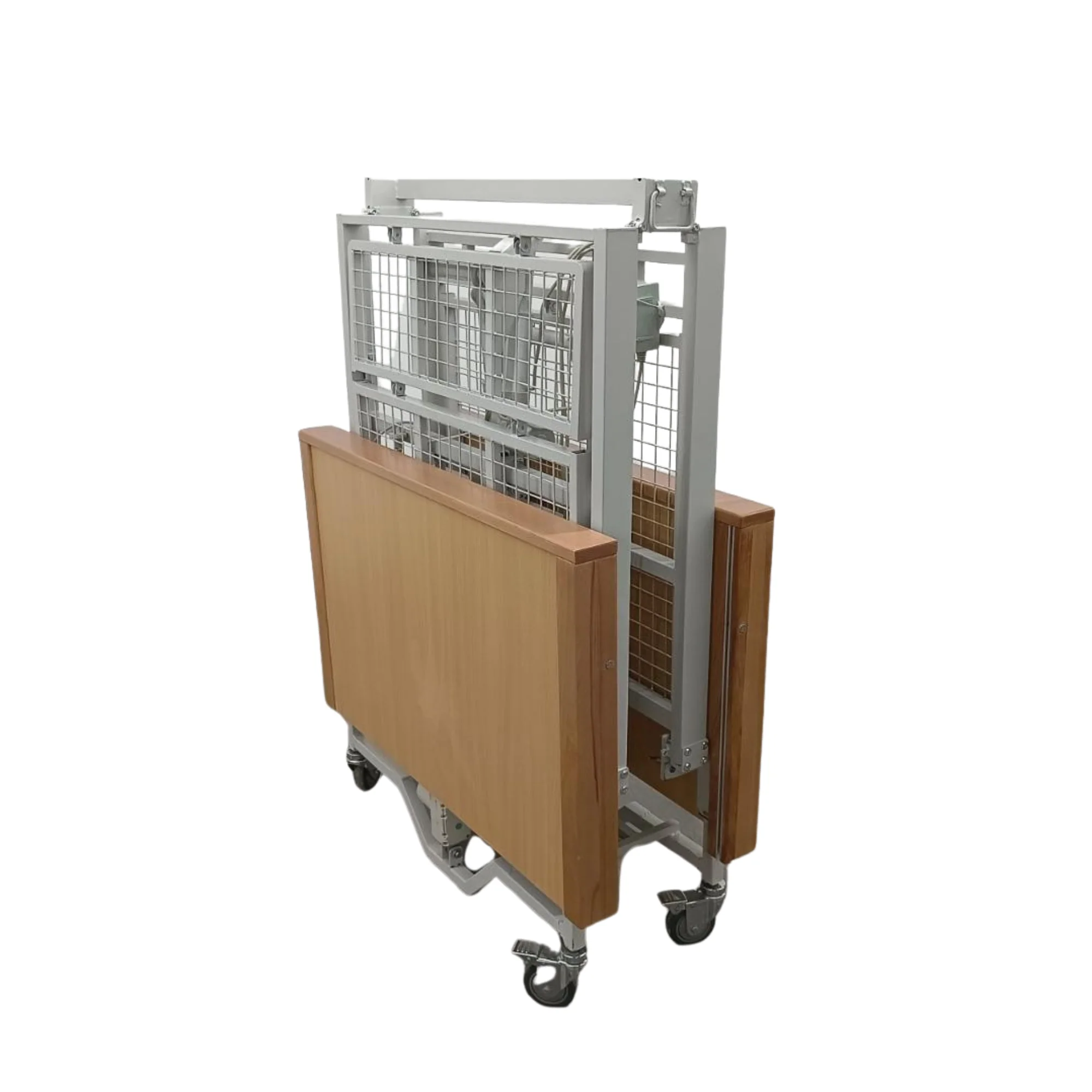 Sicurezza e igiene Il piano rete è progettato per ridurre la pressione e prevenire le piaghe da decubito, con una struttura a rete che favorisce la traspirazione. Le sponde laterali in legno a 4 sezioni offrono protezione totale anticaduta, mentre il sistema frenante indipendente sulle 4 ruote garantisce stabilità assoluta.