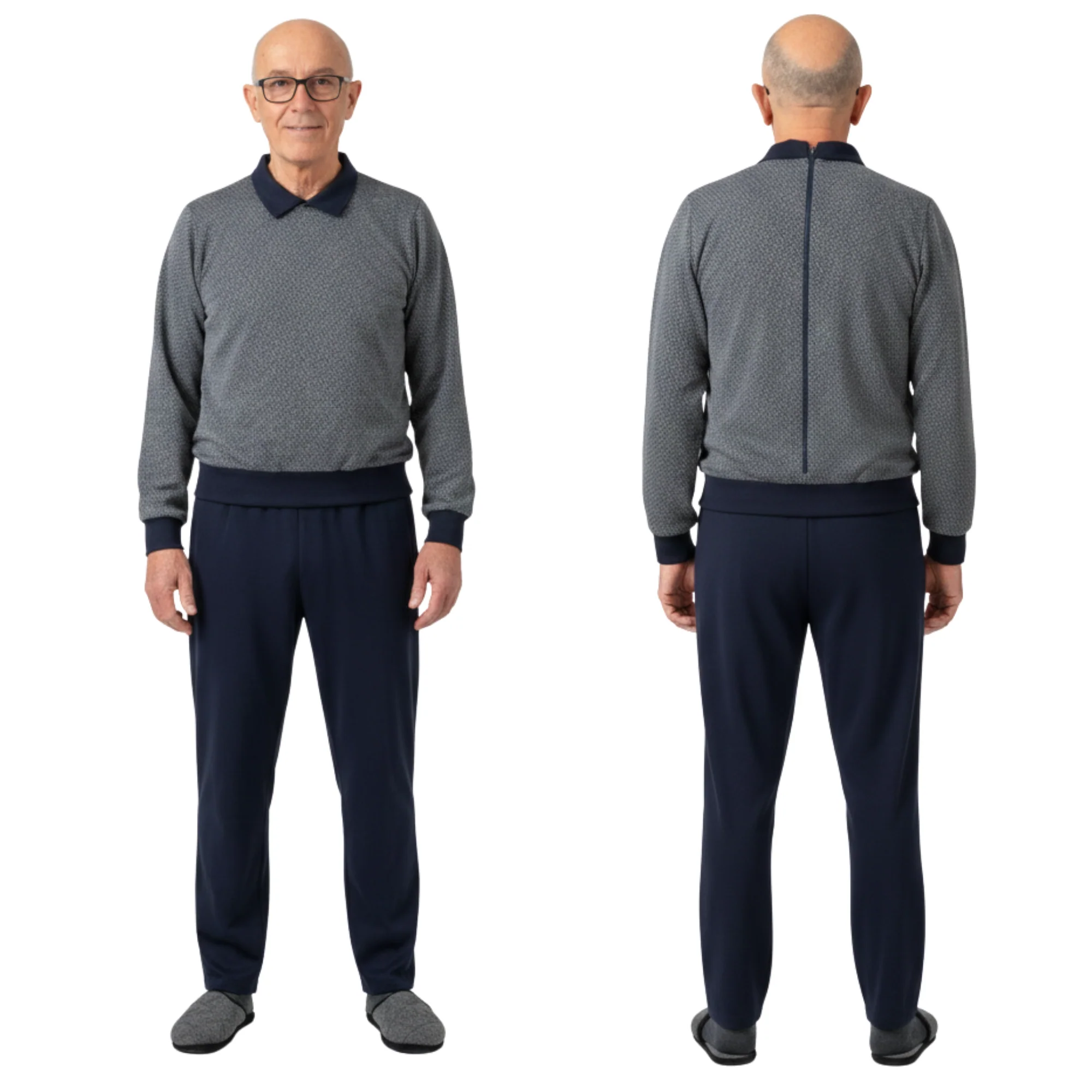 Questo capo è progettato per unire l'estetica di un completo casual alla funzionalità di un dispositivo sanitario. Pur presentandosi visivamente come un doppio capo (pantalone e felpa), si tratta in realtà di una tuta monopezzo che impedisce l'apertura autonoma da parte del paziente. La struttura è completata da pratiche tasche laterali e da una robusta cerniera posteriore posizionata sul dorso, che garantisce al caregiver il massimo controllo e al paziente una totale dignità estetica durante le uscite.